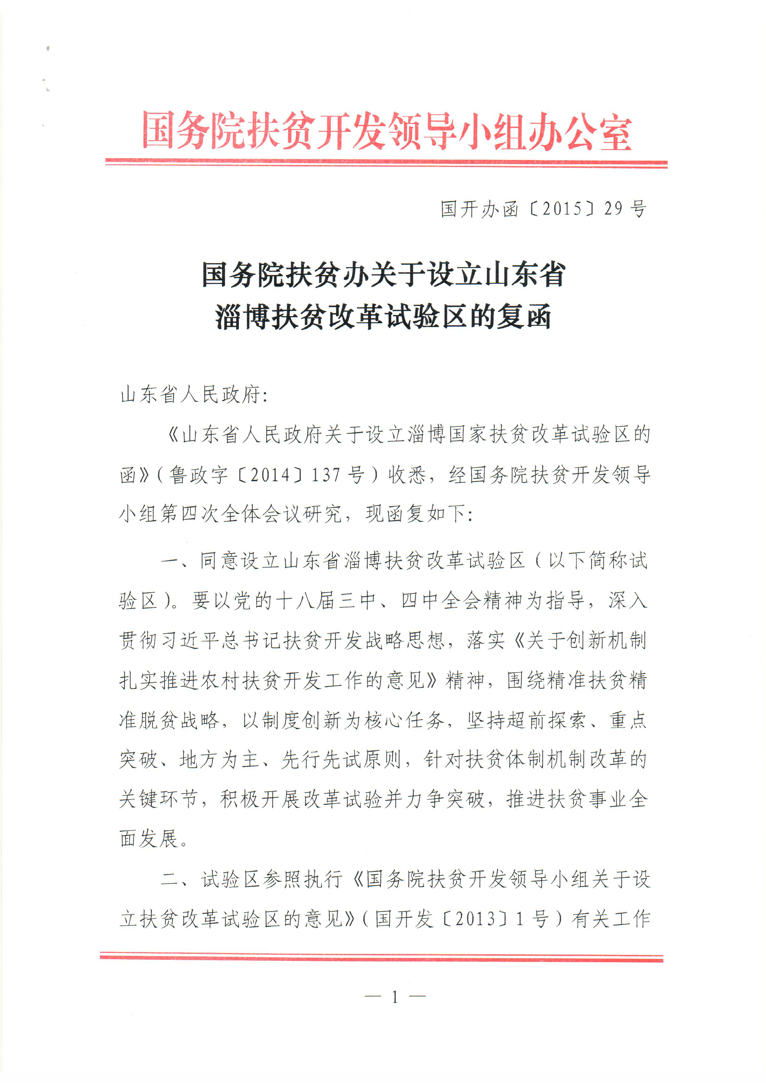 国务院扶贫办关于设立山东省淄博扶贫改革试验区的复函