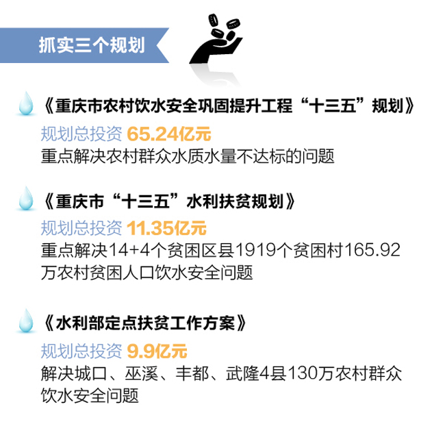 ??? 【措施】重庆市水利局主要做了这些工作,一是摸清真实缺水情况,找准问题。从去年8月份开始,就和区县政府一块摸排清楚了全市的农村饮水安全基本现状情况,编制了《全市农村饮水安全扶贫工作方案》,今年3月又编制完成了《重庆市农村饮水安全巩固提升工程“十三五”规划》,突出用两年时间全面解决1919个贫困村48万户160多万贫困人口饮水不安全问题。