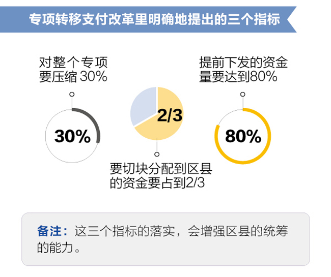 ??? 增加试点资金,不仅包括财政专项扶贫、现代农业生产发展、农业综合开发补助等20项中央资金,还新增20项市级资金,统筹整合使用的资金达到44项,涉及17个市级部门,对纳入统筹整合使用的财政涉农资金,市级主管部门按照原渠道、采用因素法的方式切块下达,但资金项目审批权限下放到区县,突破“专款专用”规定,通过科学的规划和有效的项目平台确定具体投入。同时,大力推进的转移支付制度改革中,明确地提出了专项转移支付改革里的三个指标。如图所示: