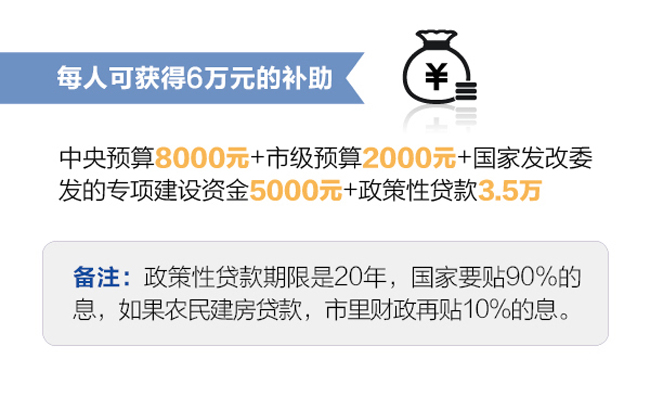 ??? 今年将从政策和资金双管齐下,确保搬8万人,力争搬10.3万人;实施半年以来,到6月底已经完成了35826人,其中建卡贫困户28650人。同时,“十三五”期间,从国家到地方对高山扶贫的资金筹措都非常有力。具体补助情况如图所示: