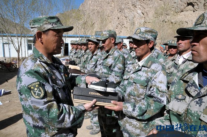 刘前东给民兵发放运动鞋 ?丁旭 摄 | ||||