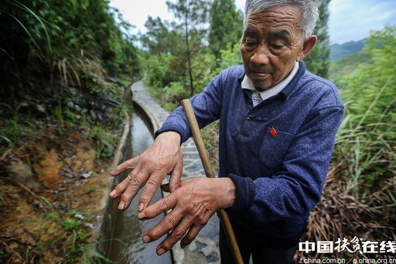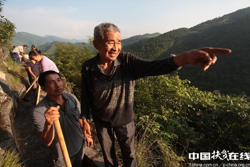 黄大发日渐粗糙的双手 ?潘凌峰 摄 半个世纪前,关于草王坝修渠引水的蓝图被铺开,老支书黄大发把实现梦想的手,指向了壁立千仞的擦耳岩—— “山高石头多,出门就爬坡,一年四季包谷沙,过年才有米汤喝。”1995年前的草王坝因为缺水,全村种的是包谷洋芋,吃不上白米饭,只能吃包谷沙,无水、无电、无路,男人娶不上媳妇,光棍村的名声不胫而走。 水,是草王坝人生生世世的想,年年岁岁的盼哟! 1936年出生在草王坝的黄大发,从小是孤儿,靠着给邻村的亲戚卖力气干粗活拉扯长大。1959年,23岁的黄大发加入中国共产党。同年,他被推选为草王坝大队长。 黄大发立誓:决心为村民干三件事:引水、修路、通电。23岁的黄大发义无反顾地走上了山崖,开始了这段历时36年之久的修渠历程。 草王坝缺水,但几公里外的野彪村水源富足,只要劈开阻隔两村的灵宝山,螺蛳河的水就能流进草王坝。