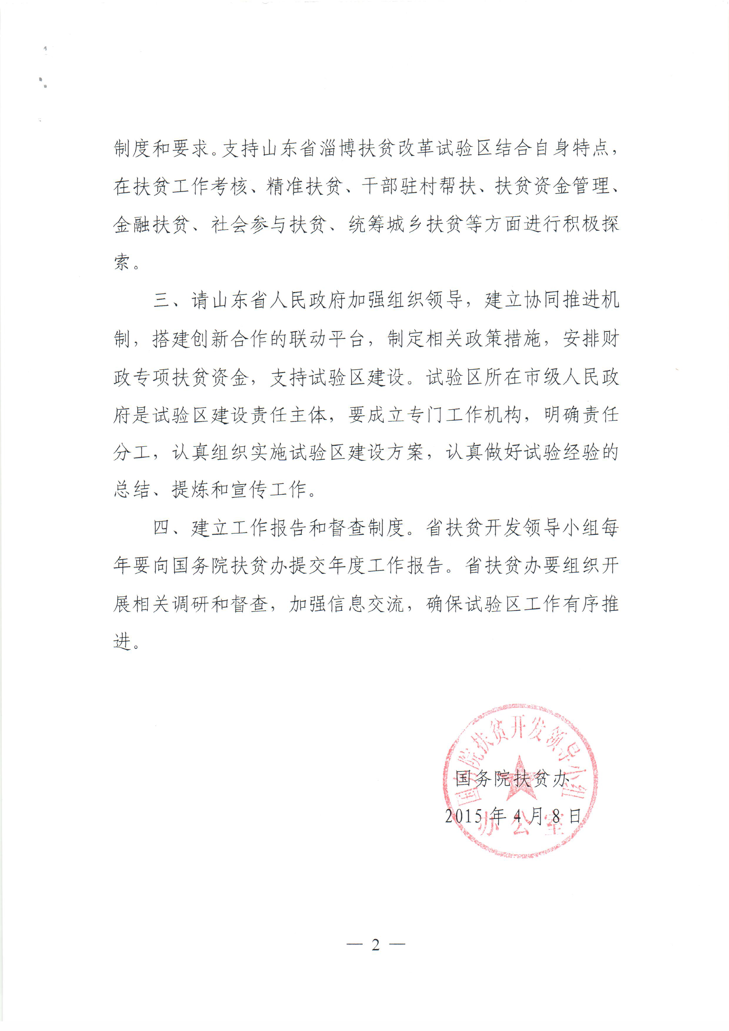 国务院扶贫办关于设立山东省淄博扶贫改革试验区的复函